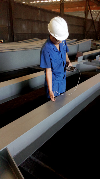 | 質(zhì)檢員正在使用超聲波探傷儀探傷構(gòu)件焊接質(zhì)量 | 質(zhì)檢員正在使用測厚儀檢測構(gòu)件漆膜厚度 |